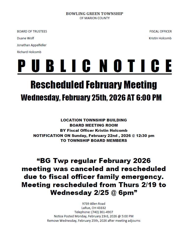 Bowling Green Township provides its residents with road maintenance and cemetery management services. We have direct responsibility for maintaining over 20 miles of roads and managing three cemeteries.